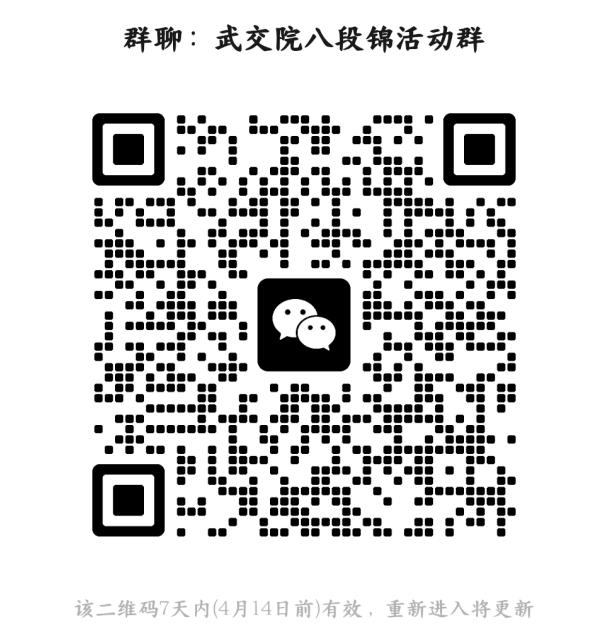 有意参与的会员请扫描二维码加入群聊 “武交院八段锦活动群” 报名,每次活动限定 20 人参加,额满即止。
