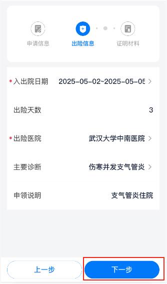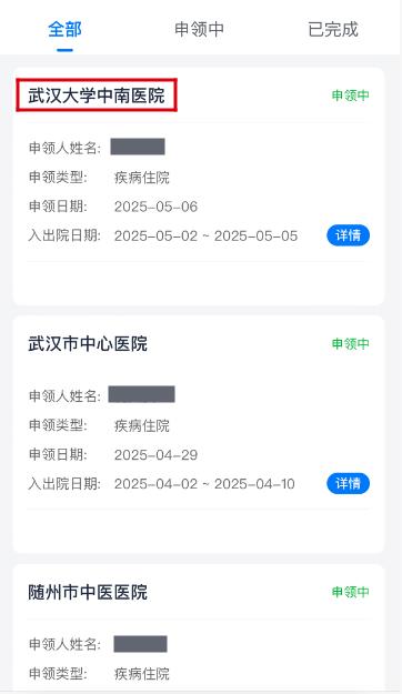 7. 提交后,自动弹到“申领记录”详情界面,见此界面,表示本次互助金申领提交成功;此外,也可在主界面申领记录查询中看到本次申领详情。