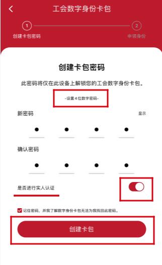 (3) 设置4位数字卡包密码后点击“创建卡包”,并勾选进行实人认证。