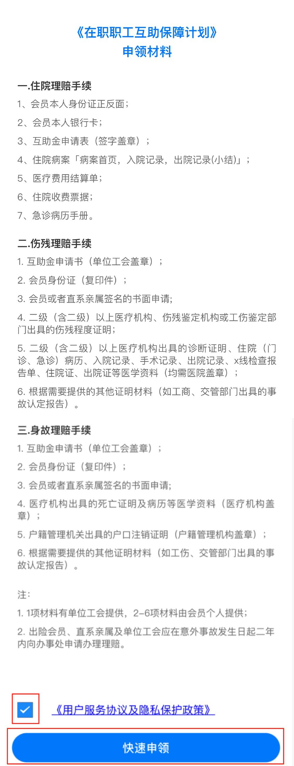 5. 进入申领页面后,详细了解申领材料信息,下拉至页面末,勾选《用户服务协议及隐私保护政策》,点击快速申领。