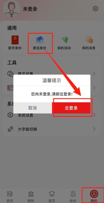 (1) 点击“我的”,点击“激活身份”,弹出提示框,点击“去登录”。