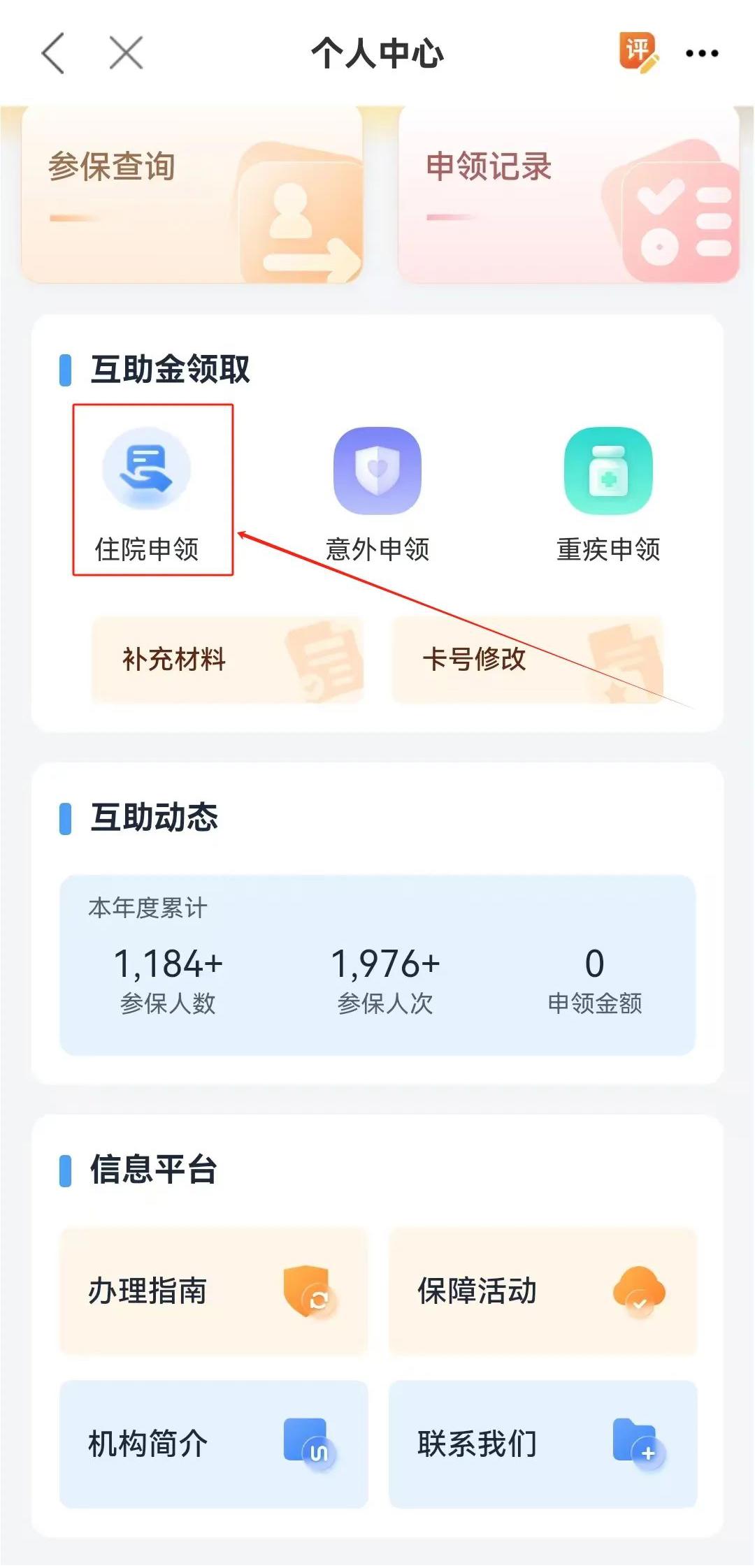4. 进入个人中心页面后,根据参加险种及病情选择互助金领取类别,并点击进入。